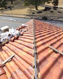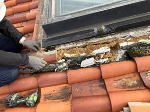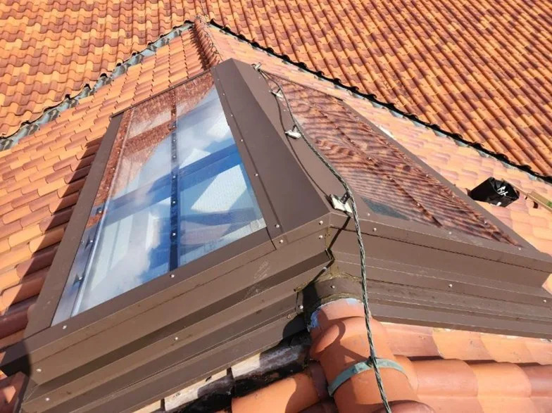 スパニッシュ瓦特有の大きなウェーブ形状により、棟および降り棟の漆喰が通常より広範囲で劣化し、さらに大型トップライト周りでも深刻な雨漏りが発生していました。点検の結果、棟内部には長期間の浸水跡が確認され、補強材として使われていた木材は腐食が進行。トップライトのガラスシールやパッキンも劣化しており、表面コーキングだけでは改善できない状態でした。