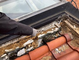 トップライトの水下側では、のし瓦下の土台が崩壊寸前まで劣化していました。水を吸い続けたことで脆くなっており、瓦を支える機能が大きく低下している様子が見て取れます。