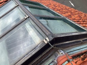 トップライトのガラス周りにあるパッキン材が大きく劣化し、硬化・収縮が進行しています。この状態では通常のコーキング補修だけでは密閉性が確保できず、数年以内に再度雨漏りが発生する可能性が高い状況です。