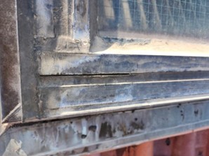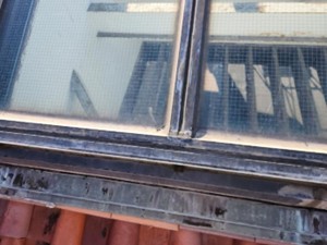 ガラスフレームの接合部が裂け、シール材が機能していない状態です。既存シールでは防水力を保てず、隙間からの浸水が続く危険性が非常に高く、根本的な対策が必要であることが分かります。