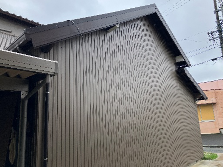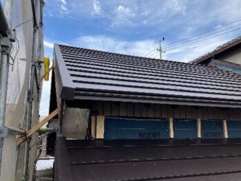 横暖ルーフαSに葺き替えられ、屋根全体が軽量化されスッキリとした外観に整いました。落ち着いた色調が建物と調和し、耐震性・防水性も大きく向上しています。