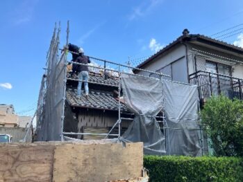 足場を設置し、安全を確保しながら既存の瓦を丁寧に撤去している様子です。屋根全体の状態を確認しつつ、慎重に作業を進めています。