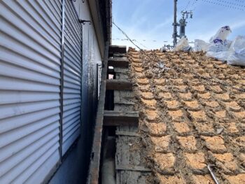 瓦を取り除き、下地の土が見えている状態です。長年の使用で劣化が進んだ部分も確認でき、葺き替えの必要性が明確になっています。