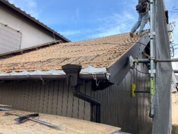 施工では、まず安全な足場を設置した上で瓦を丁寧に撤去し、劣化していた下地を新たな構造用合板へ交換。その後、雨漏りを防ぐためのルーフィングを隙間なく施工し、細部まで防水処理を徹底しました。屋根材の取り合い部分は特にリスクが高いため、職人が一つひとつの工程を慎重に進めています。