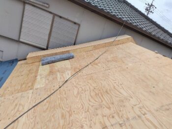新しい屋根を支えるための構造用合板を敷き詰めています。これにより、屋根全体の強度が向上し、金属屋根材をしっかり固定できる土台が整います。
