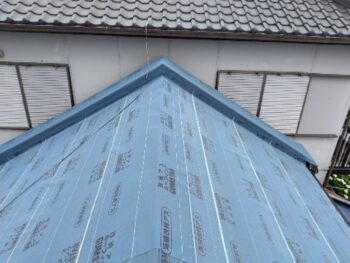 防水シートであるルーフィングを全面に施工した状態です。雨水の侵入を防ぐ最も重要な工程で、屋根の防水性能を大きく左右します。