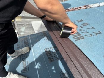 職人が細かい部位の処理を行い、雨仕舞いを丁寧に整えています。金属屋根材を取り付ける前の重要な防水処理です。
